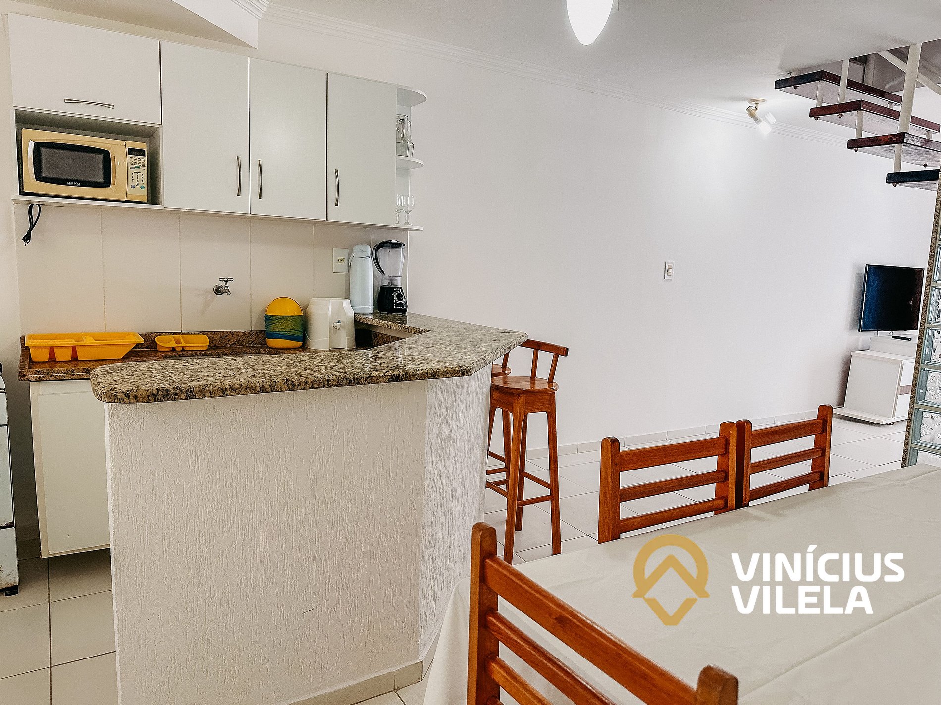 A cozinha é bem completa e oferece eletrodomésticos como liquidificador, micro-ondas, Airfryer