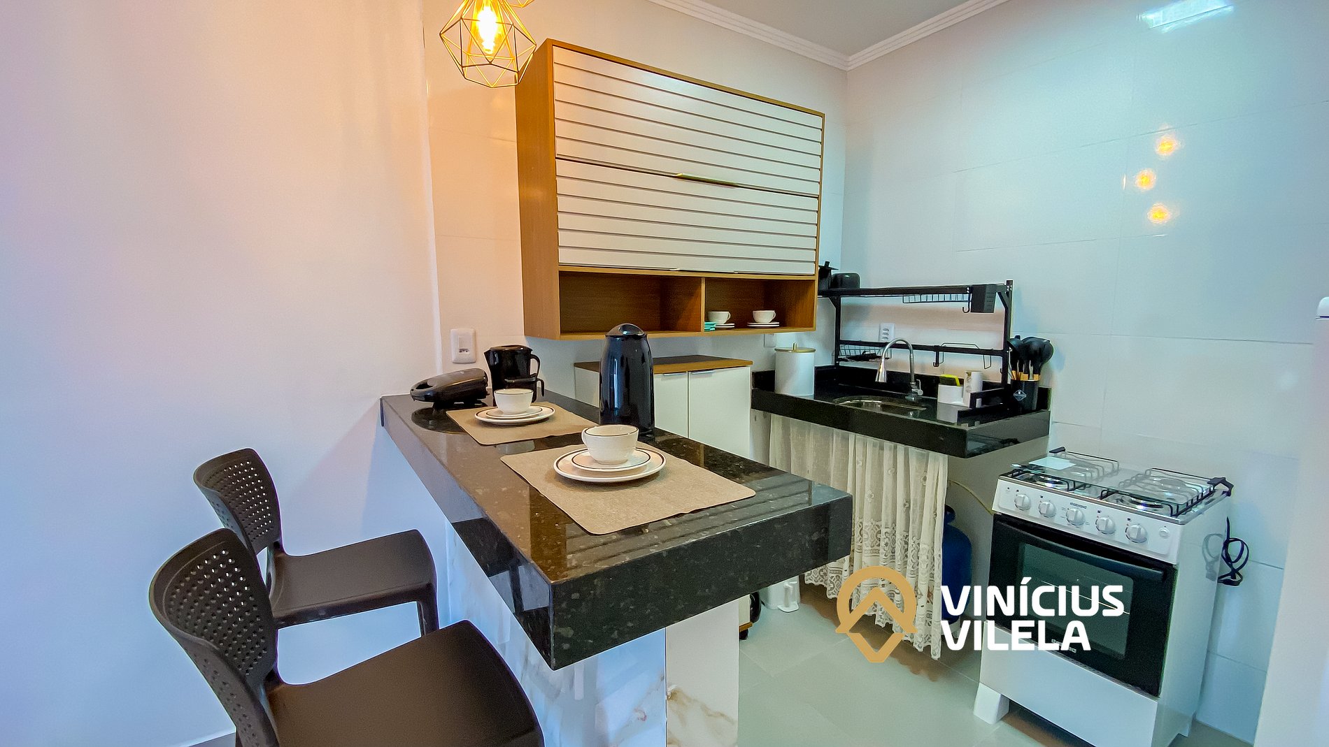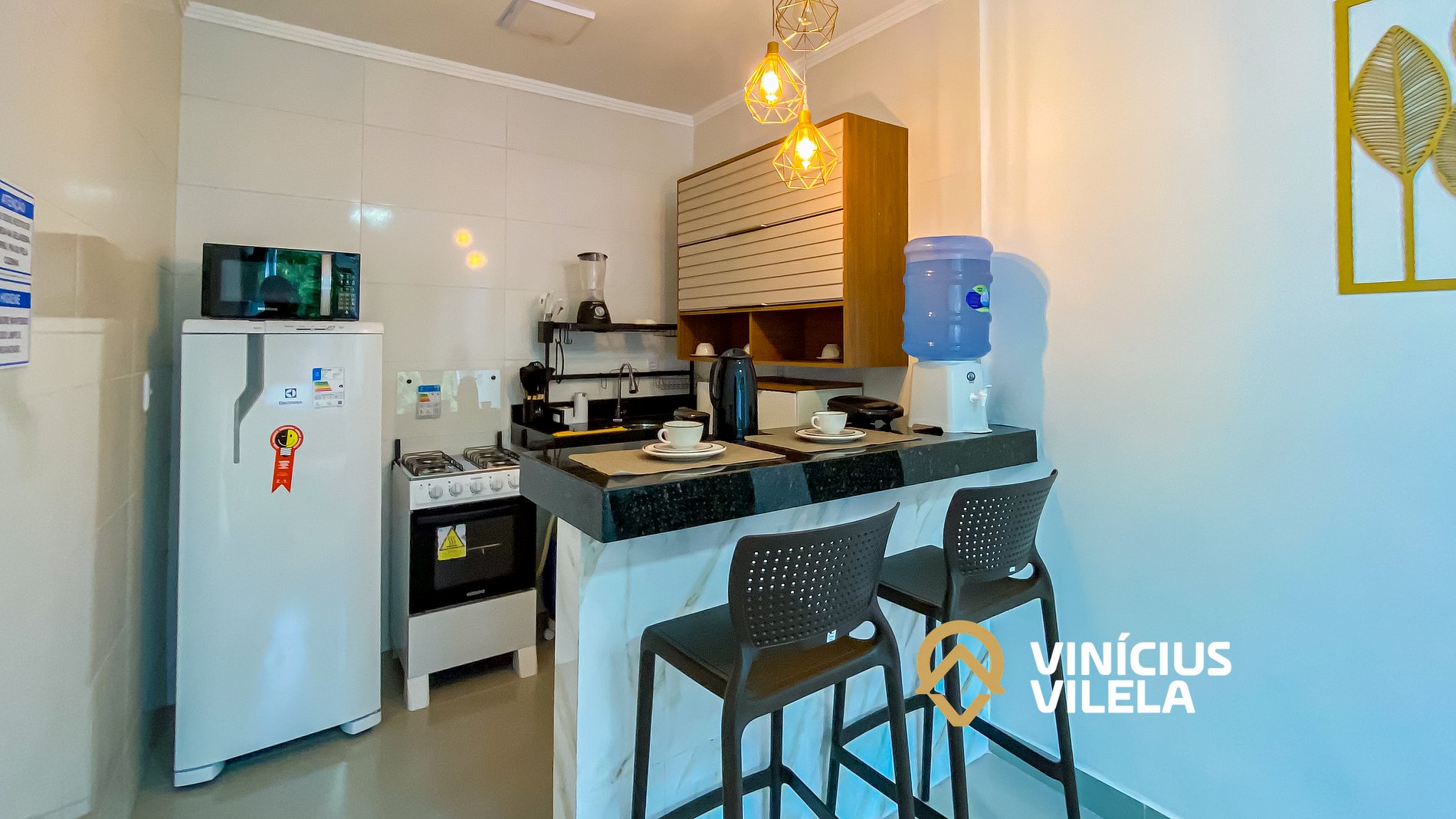 A cozinha é completa e bem equipada, contando com bancada com banquetas, geladeira, fogão, micro-ondas, liquidificador, sanduicheira, garrafa térmica para café e utensílios essenciais, permitindo preparar refeições com comodidade durante a estadia.