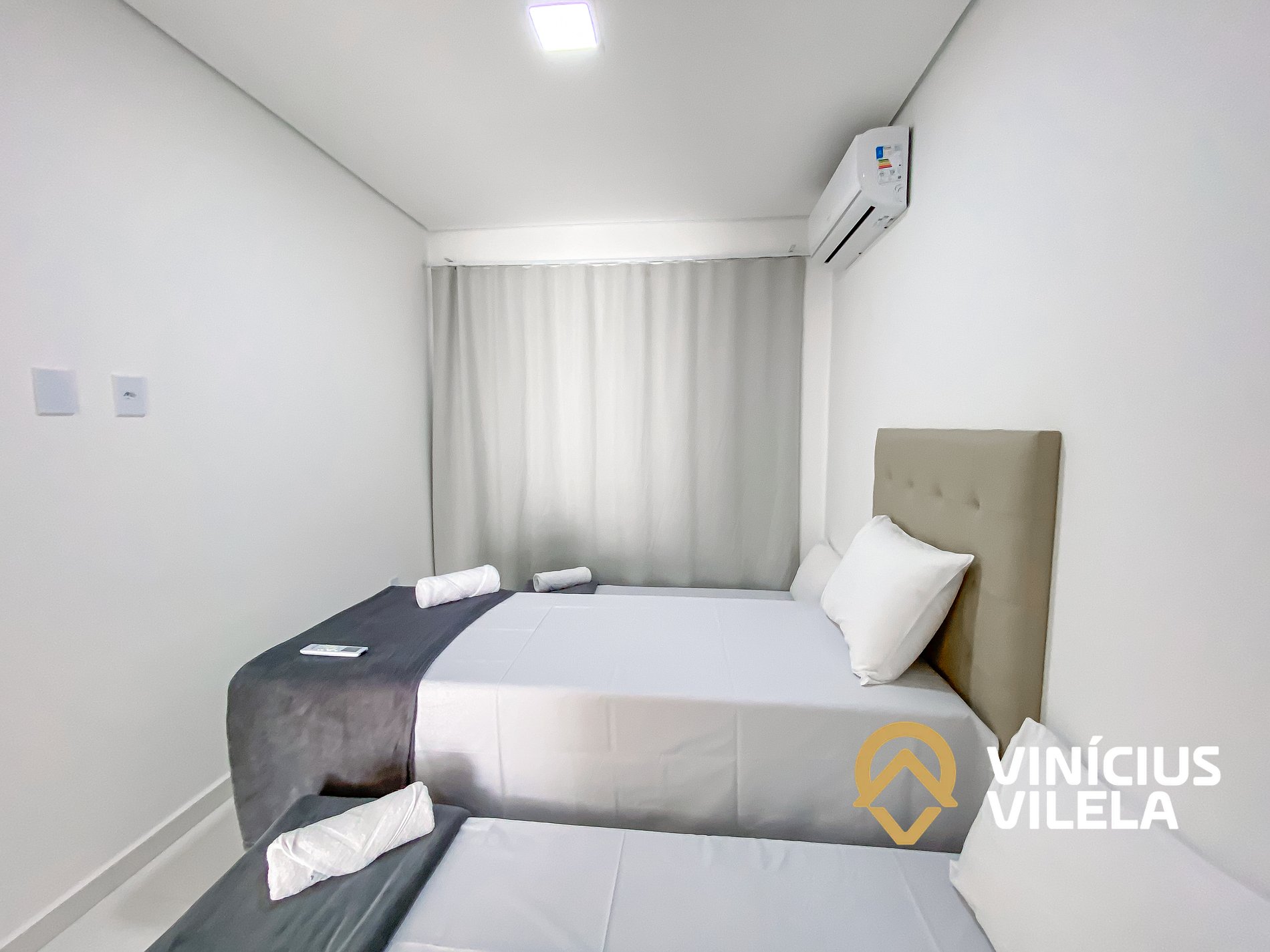 O apartamento conta com 3 quartos, sendo 2 suítes no pavimento superior uma com uma cama cama de casal e 1 de solteiro e uma demi-suite no térreo com uma 3 camas de solteiro, todos com ar condicionado Split, roupas de cama e banho, a sala com sofá- e TV , internet Wi-fi 300MBPS exclusiva do apartamento. Sala de jantar com mesa e 6 cadeiras, cozinha completa com armários , fogão, micro ondas, airfryer e utensílios, além de área de serviço com ducha e churrasqueira privativa.