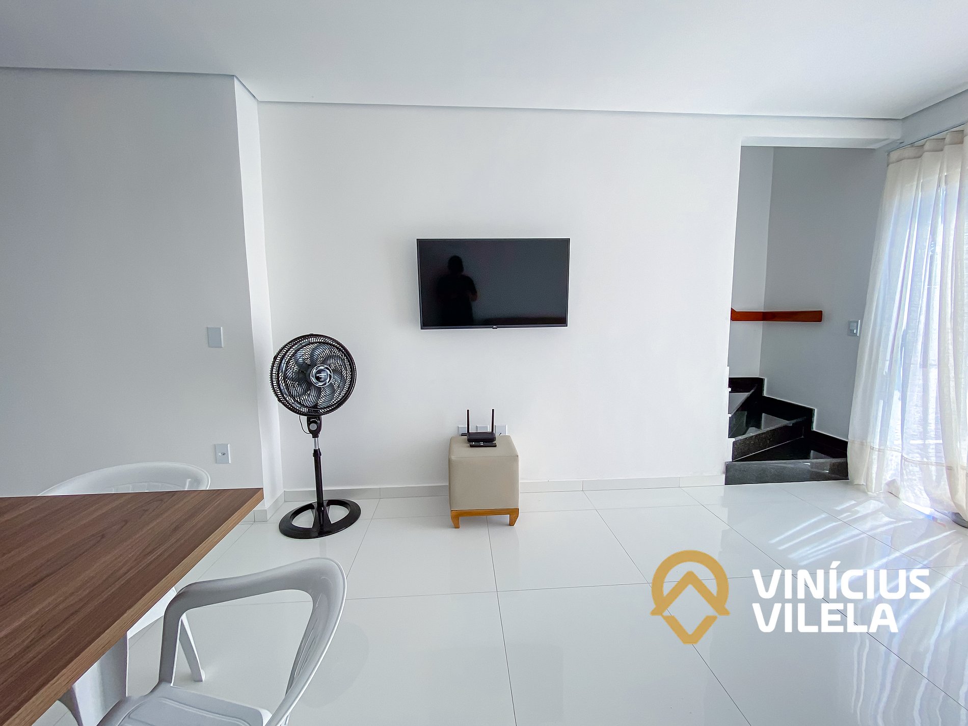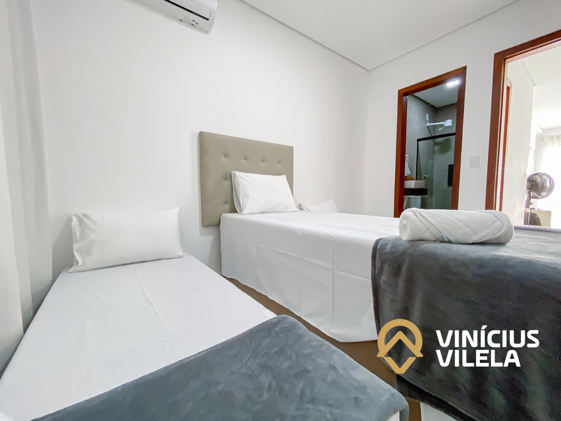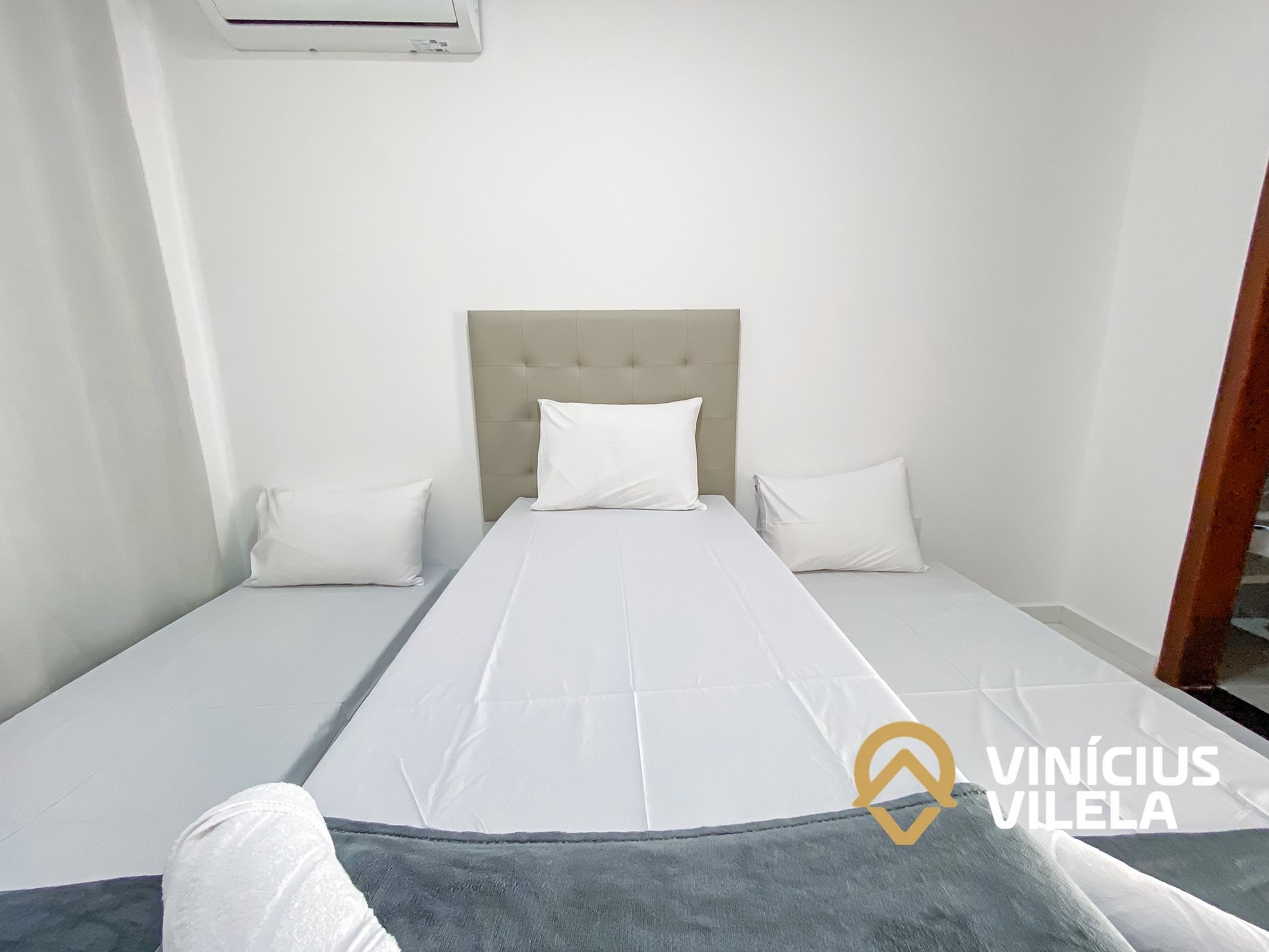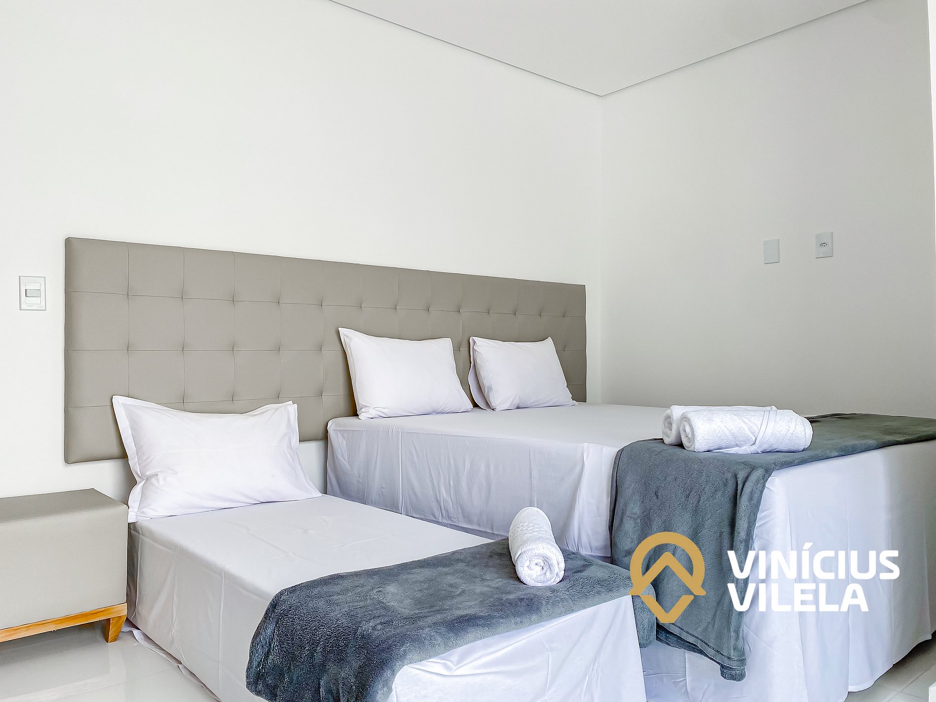 O apartamento conta com 3 quartos, sendo 2 suítes no pavimento superior uma com uma cama cama de casal e 1 de solteiro e uma demi-suite no térreo com uma 3 camas de solteiro, todos com ar condicionado Split, roupas de cama e banho, a sala com sofá- e TV , internet Wi-fi 300MBPS exclusiva do apartamento. Sala de jantar com mesa e 6 cadeiras, cozinha completa com armários , fogão, micro ondas, airfryer e utensílios, além de área de serviço com ducha e churrasqueira privativa.