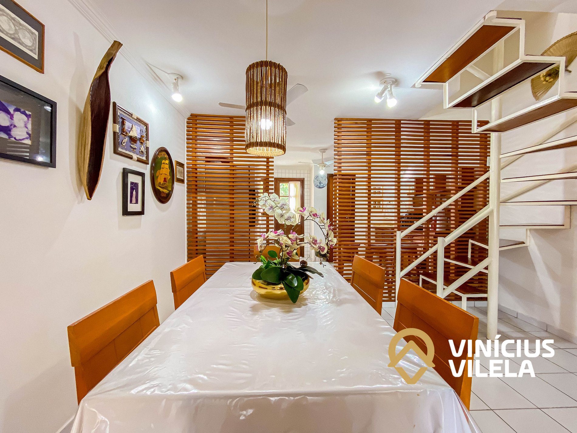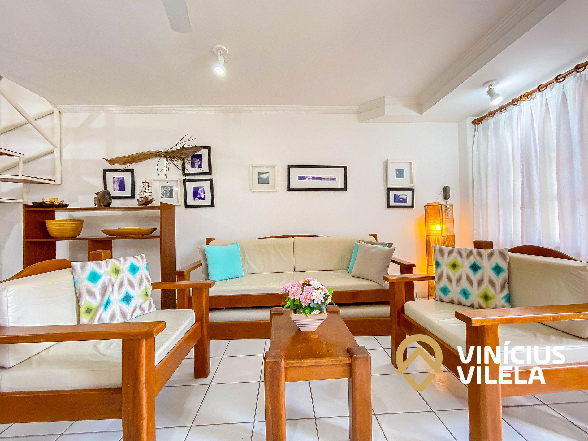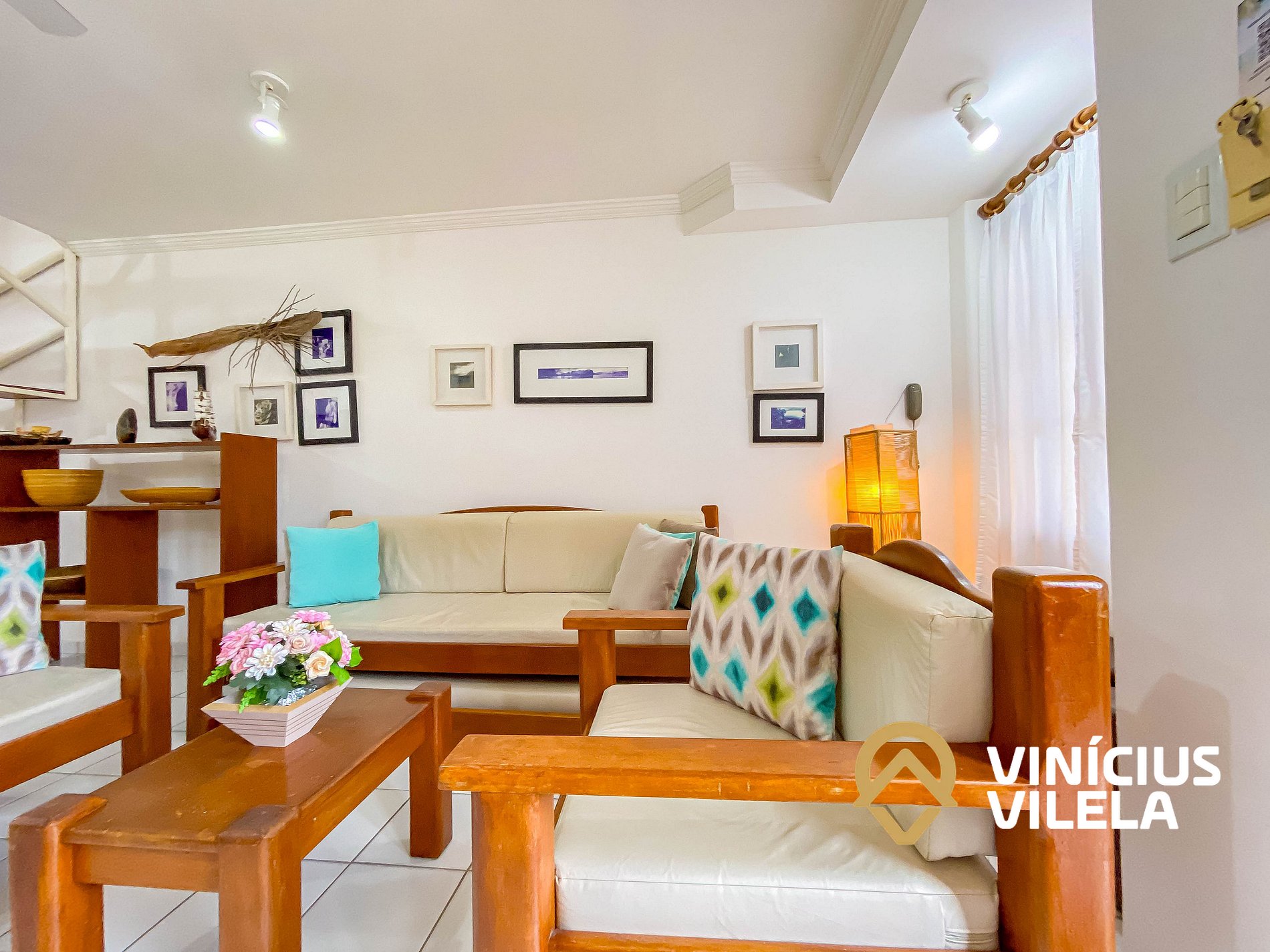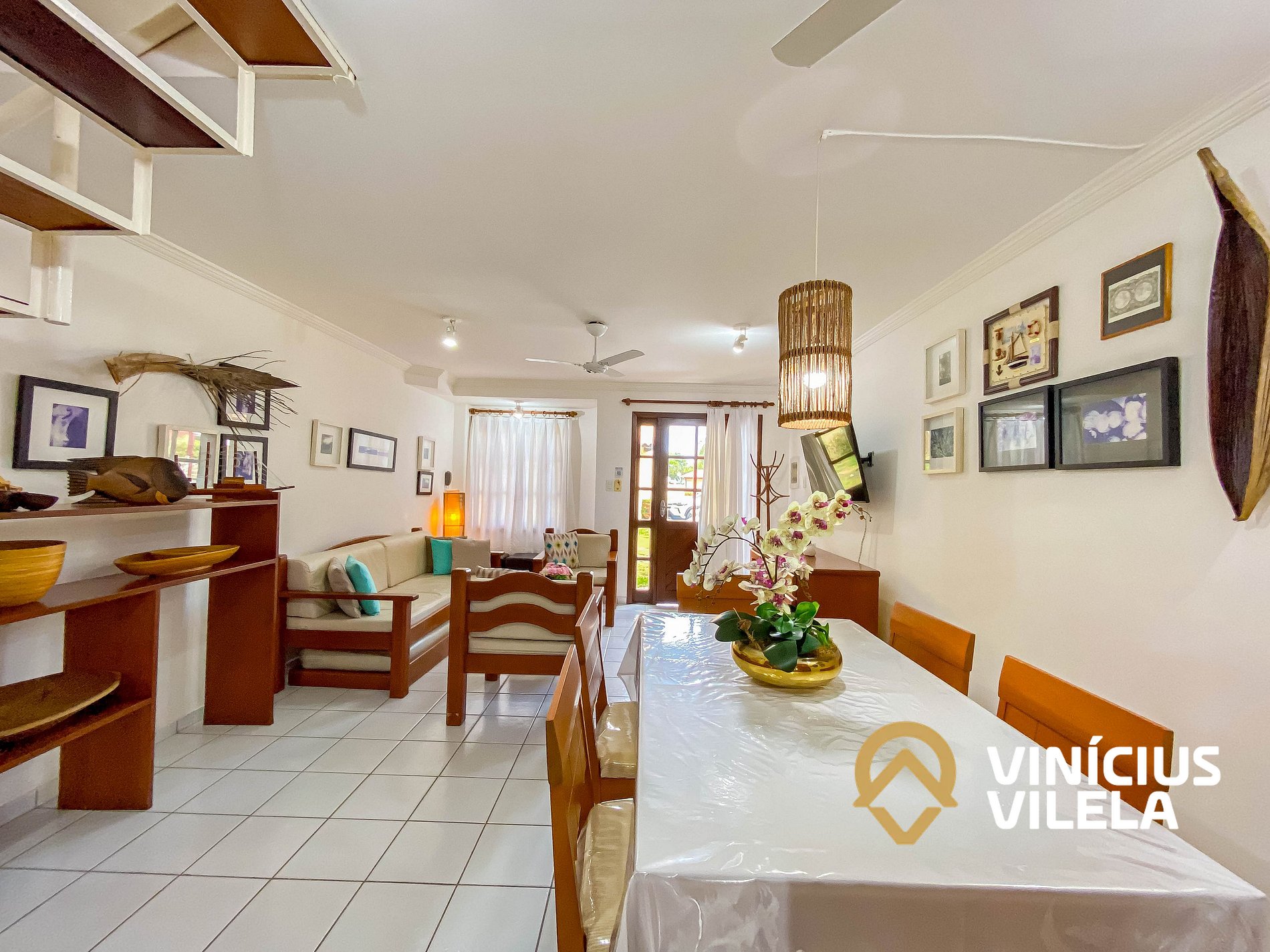 Logo na entrada possui uma ampla sala conjugada com a copa, no qual são compostas com sofá cama e almofadas, 2 poltronas , ventilador de teto, rack e TV tela plana. Mesa de madeira com 6 cadeiras.