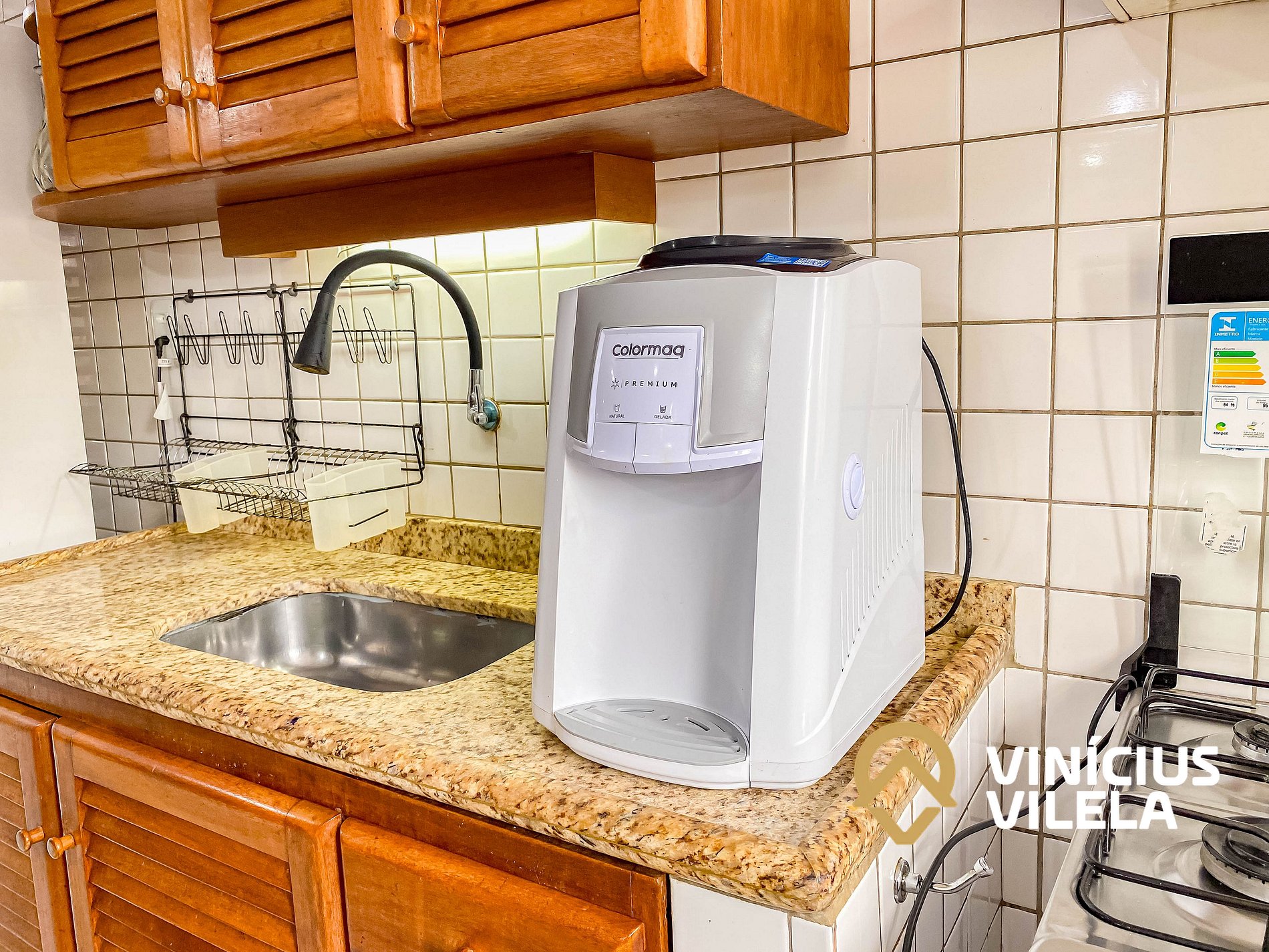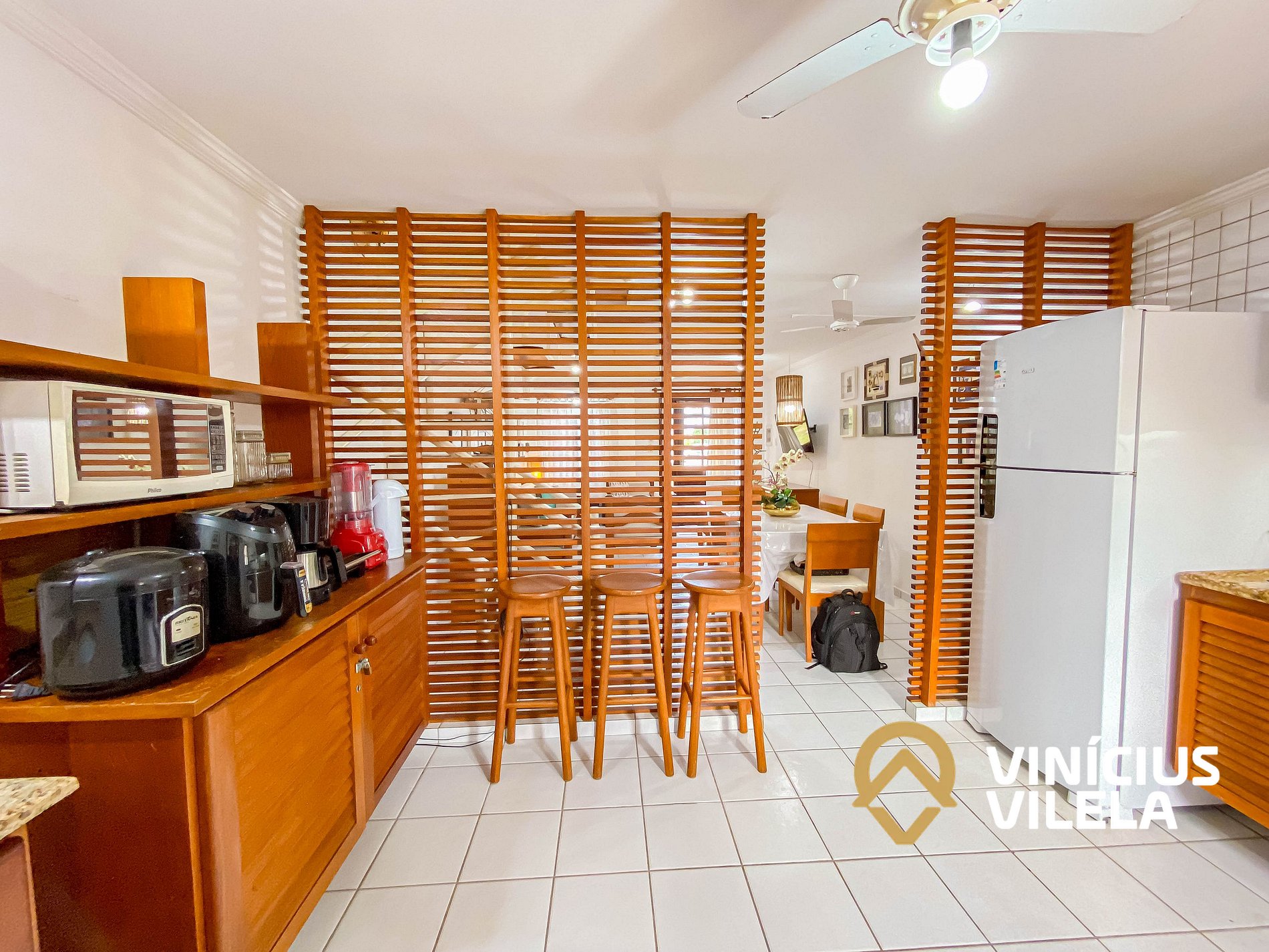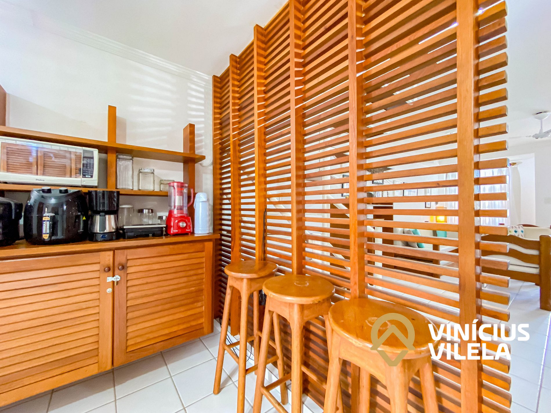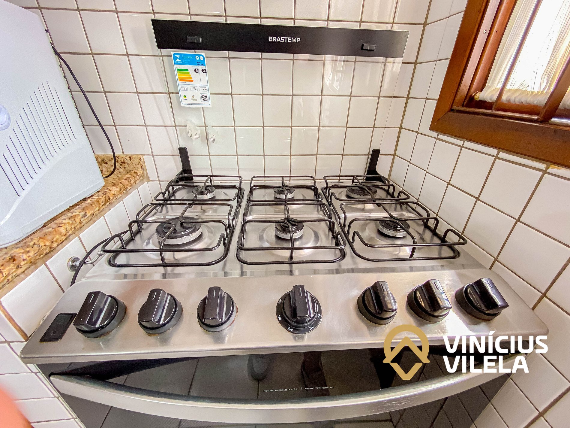 A cozinha é bem completa e oferece eletrodomésticos como liquidificador, micro-ondas,