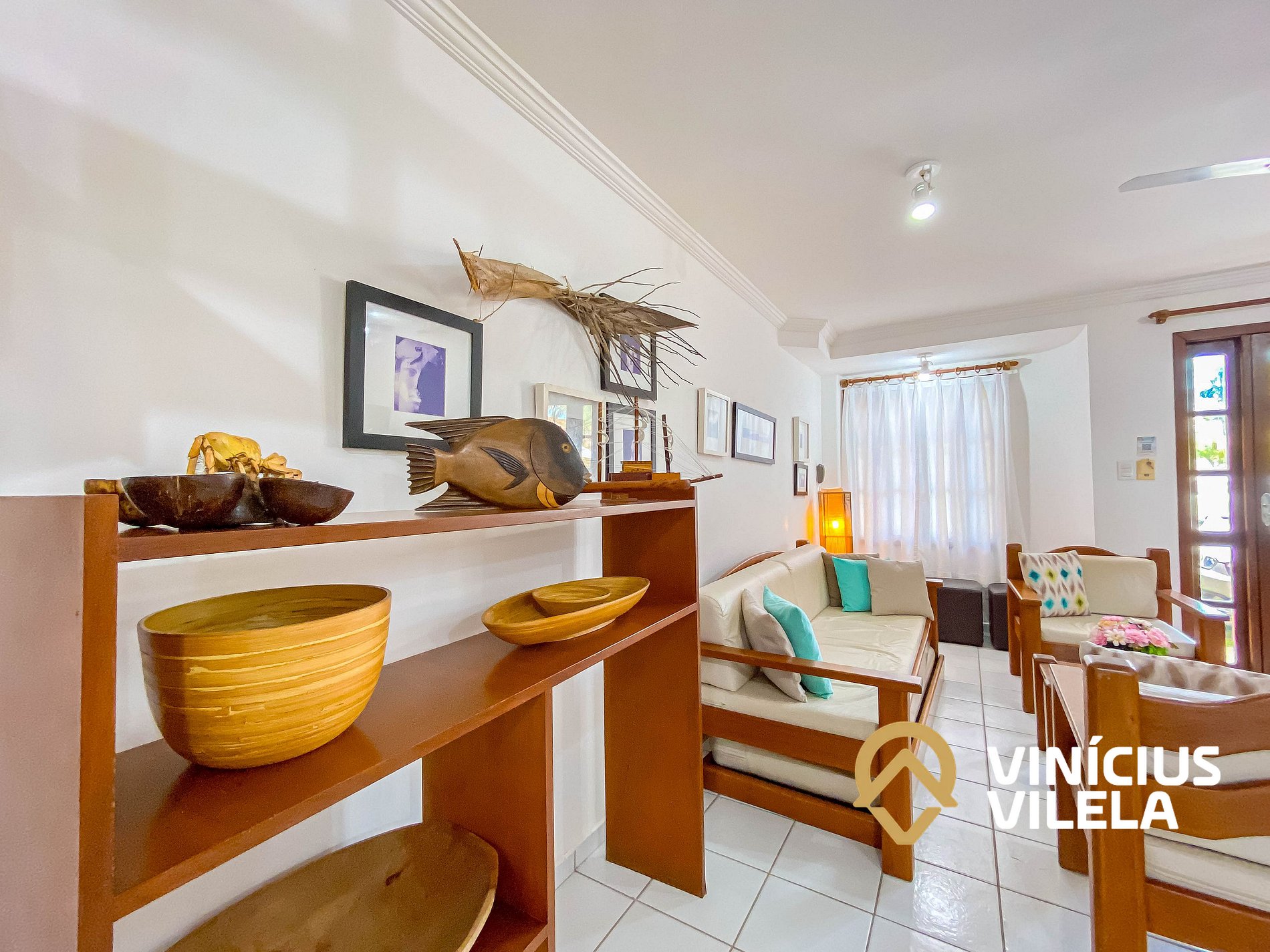 Logo na entrada possui uma ampla sala conjugada com a copa, no qual são compostas com sofá cama e almofadas, 2 poltronas , ventilador de teto, rack e TV tela plana. Mesa de madeira com 6 cadeiras.