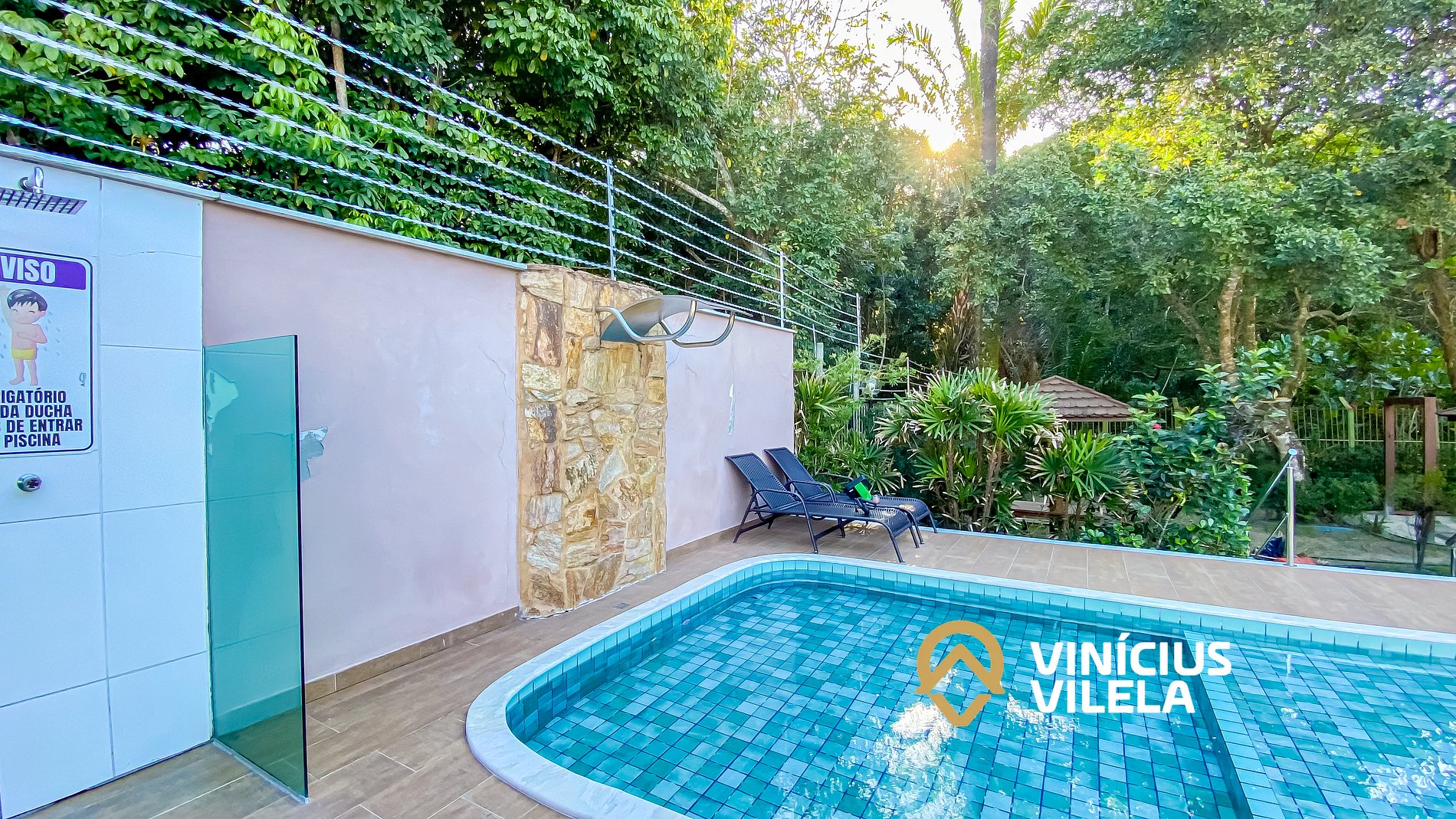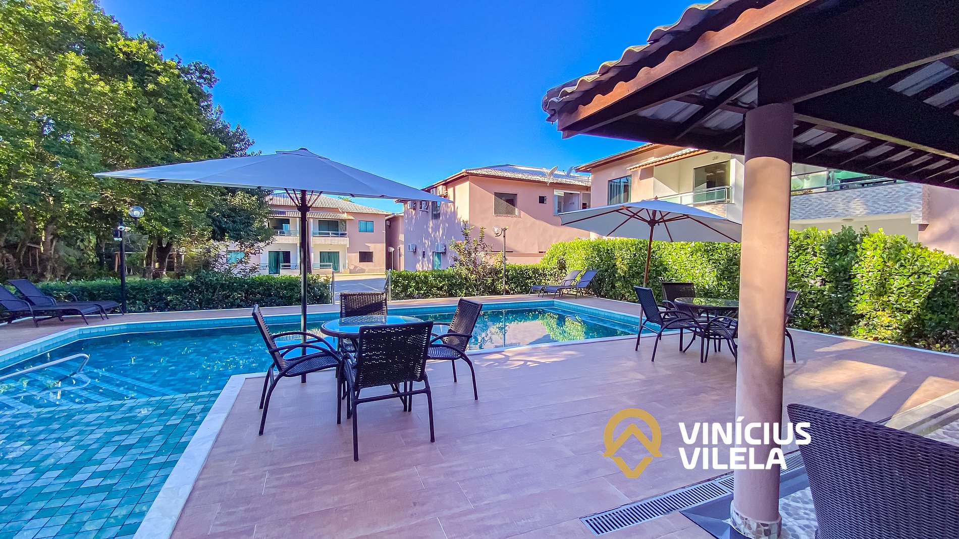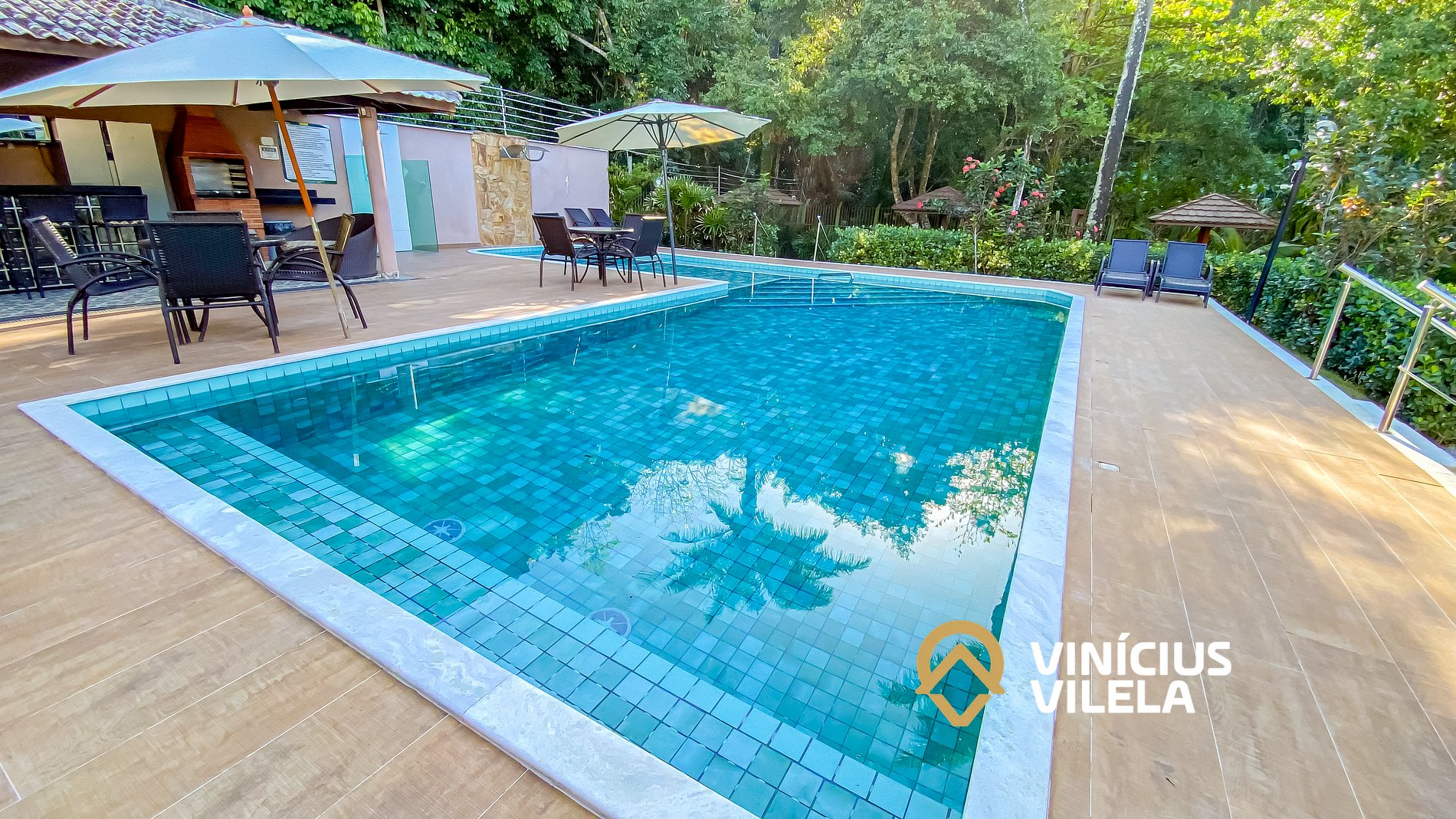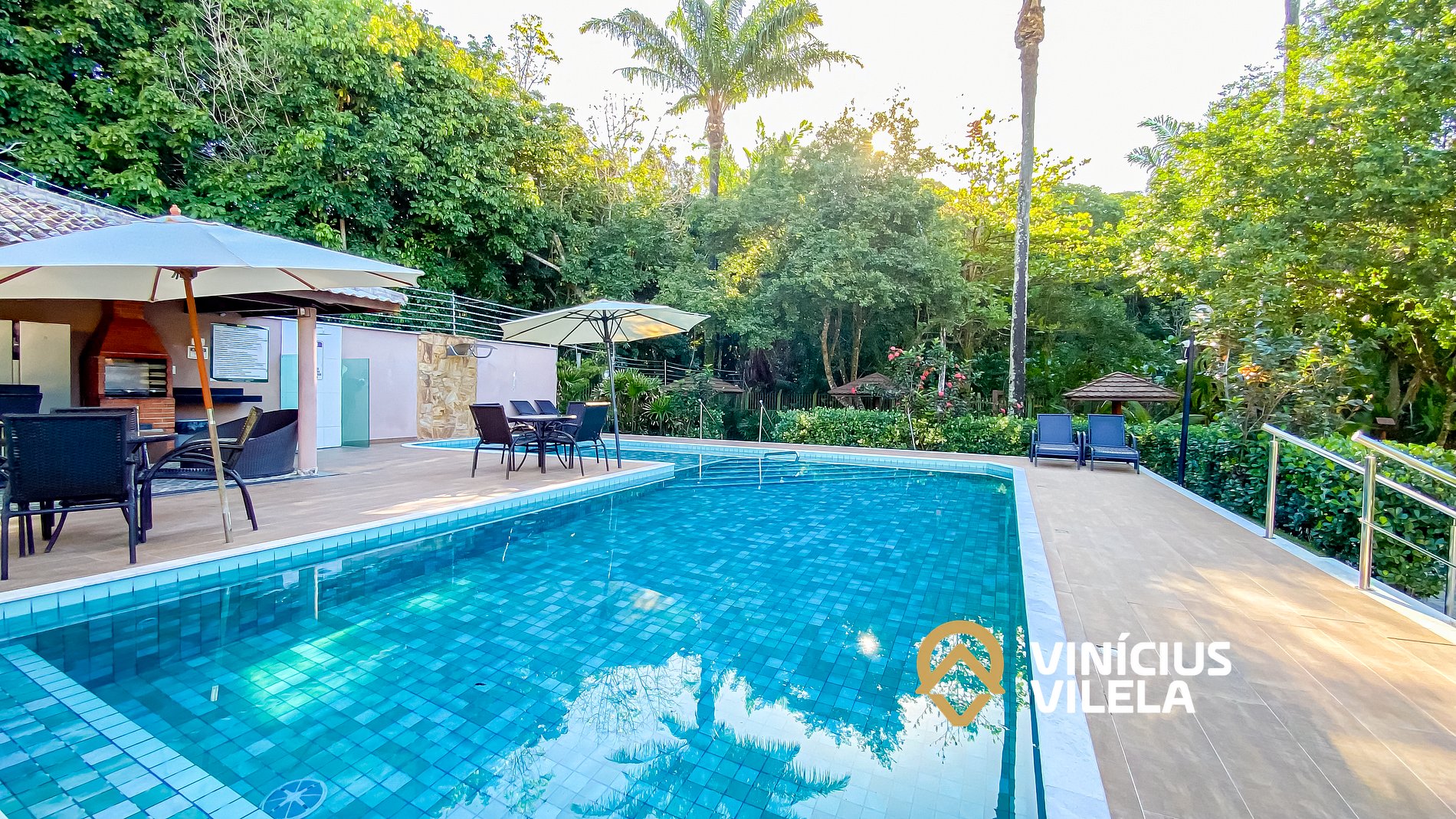 - condomínio com piscina, espreguiçadeiras , rodeado de muita área verde.