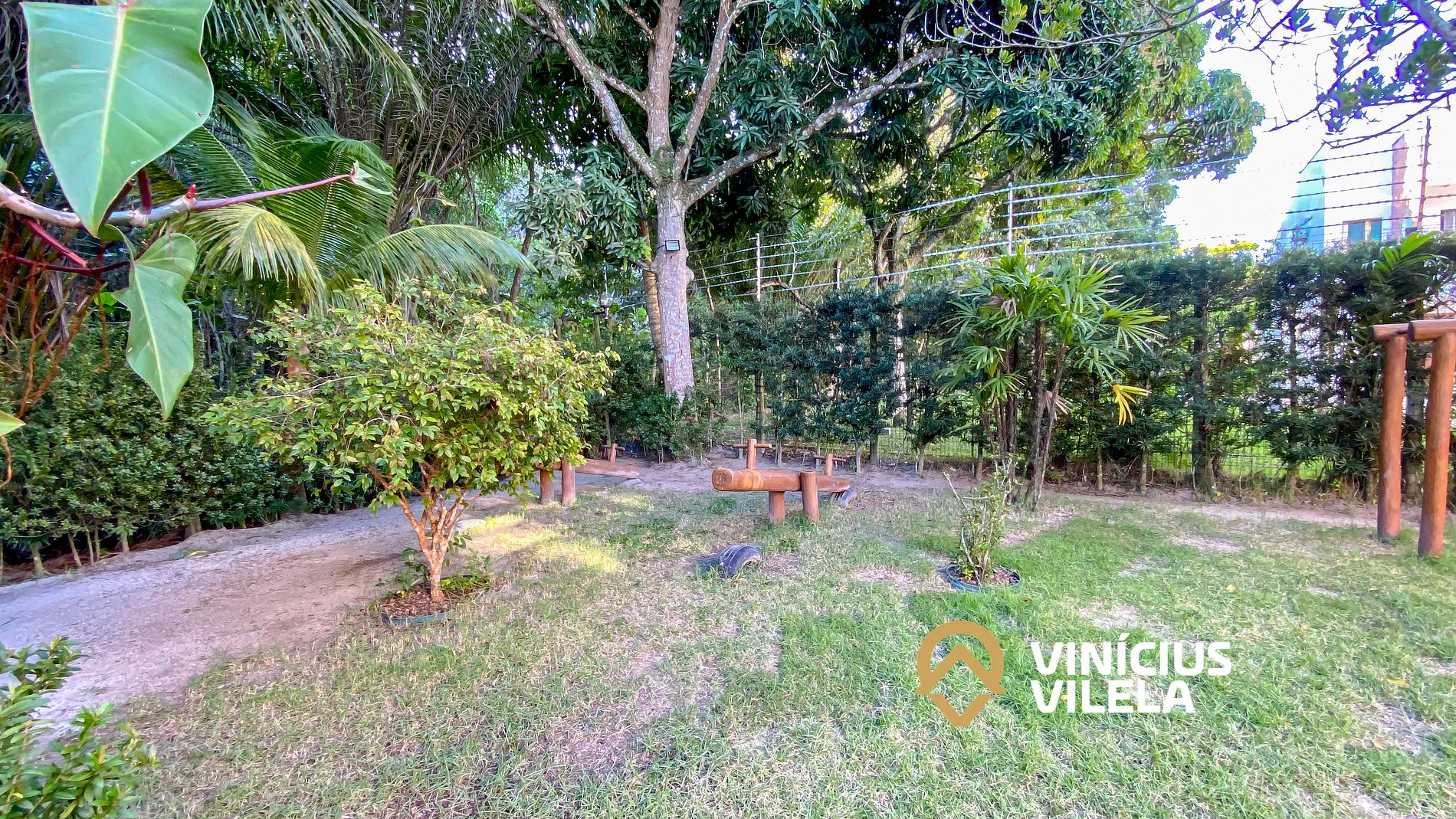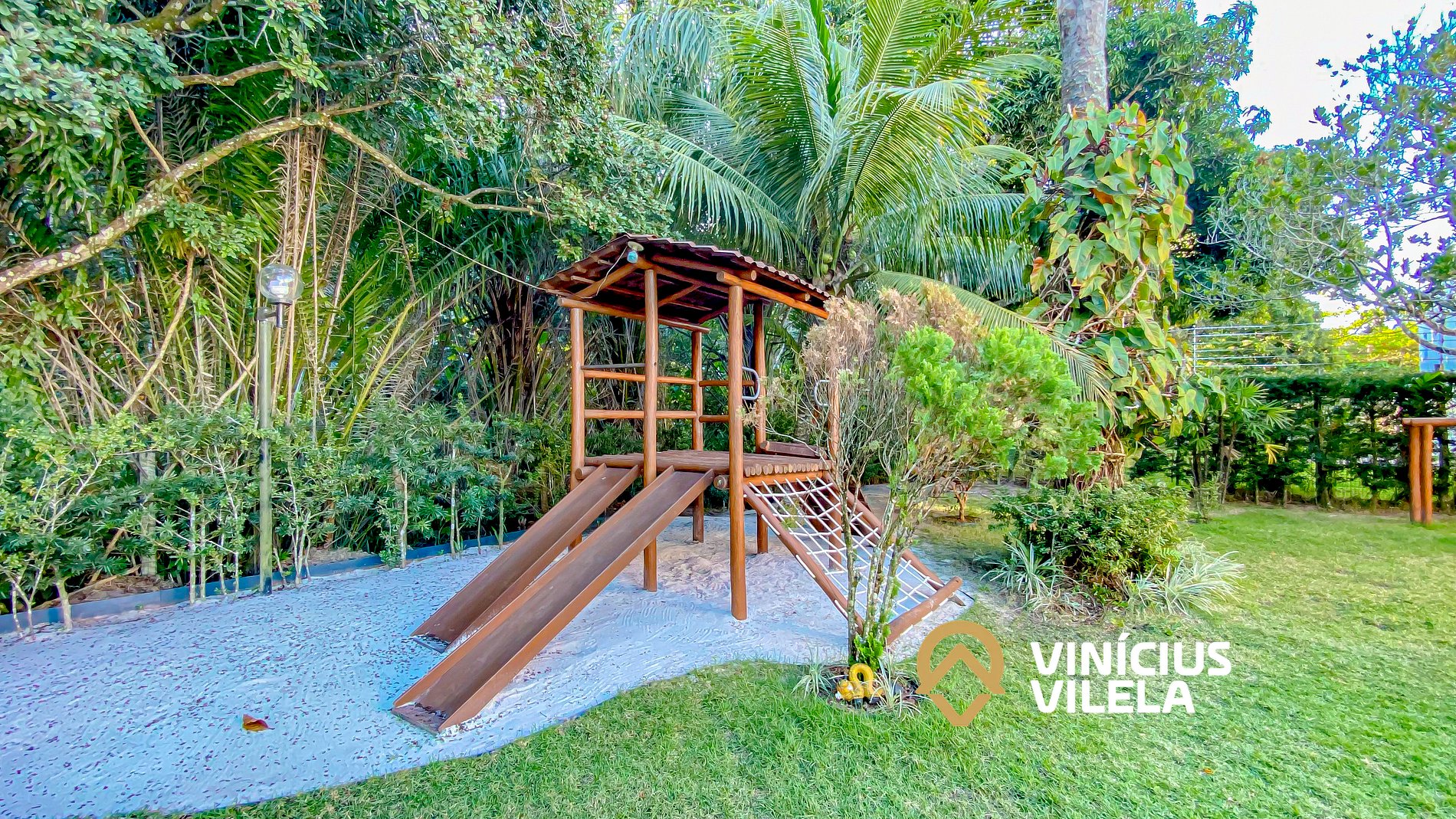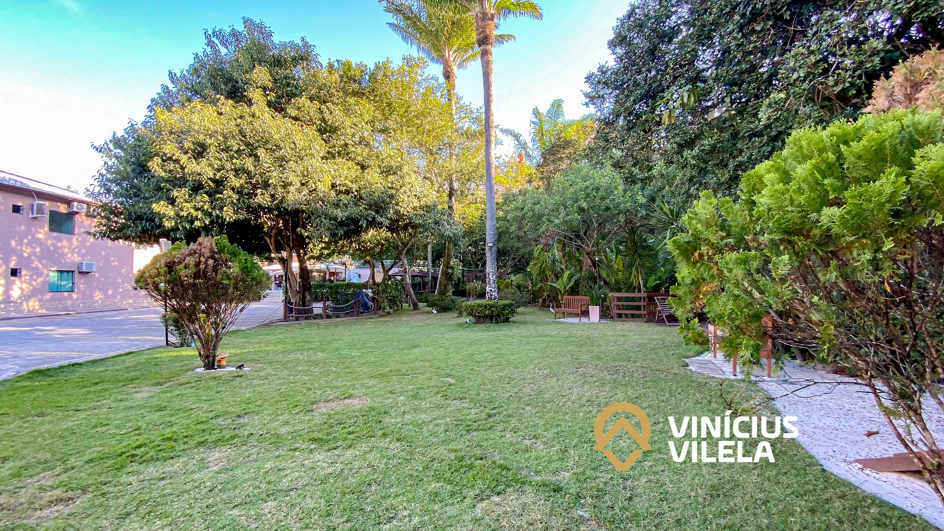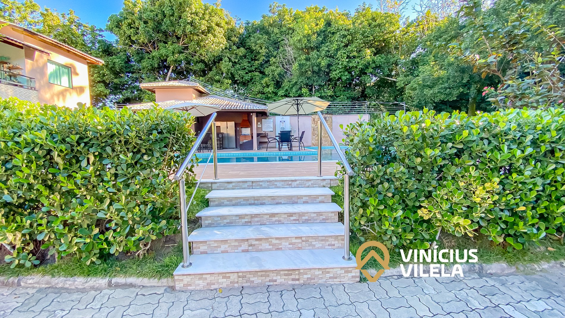 - condomínio com piscina, espreguiçadeiras , rodeado de muita área verde.